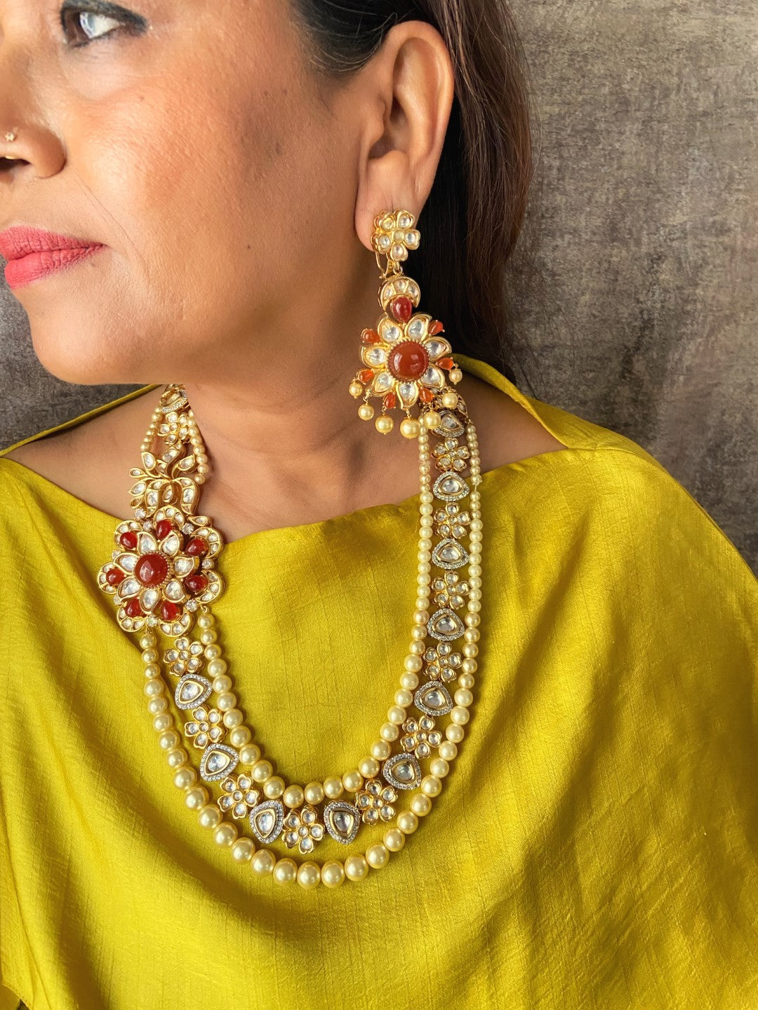Radiate royalty and elegance in our triple layered handcrafted necklace set with earrings in kundan with red onyx and pearls.Ideal to be worn on your ethnic wear and perfect jewellery for wedding festivities.Every piece of our's is curated with high quality semi-precious stones.